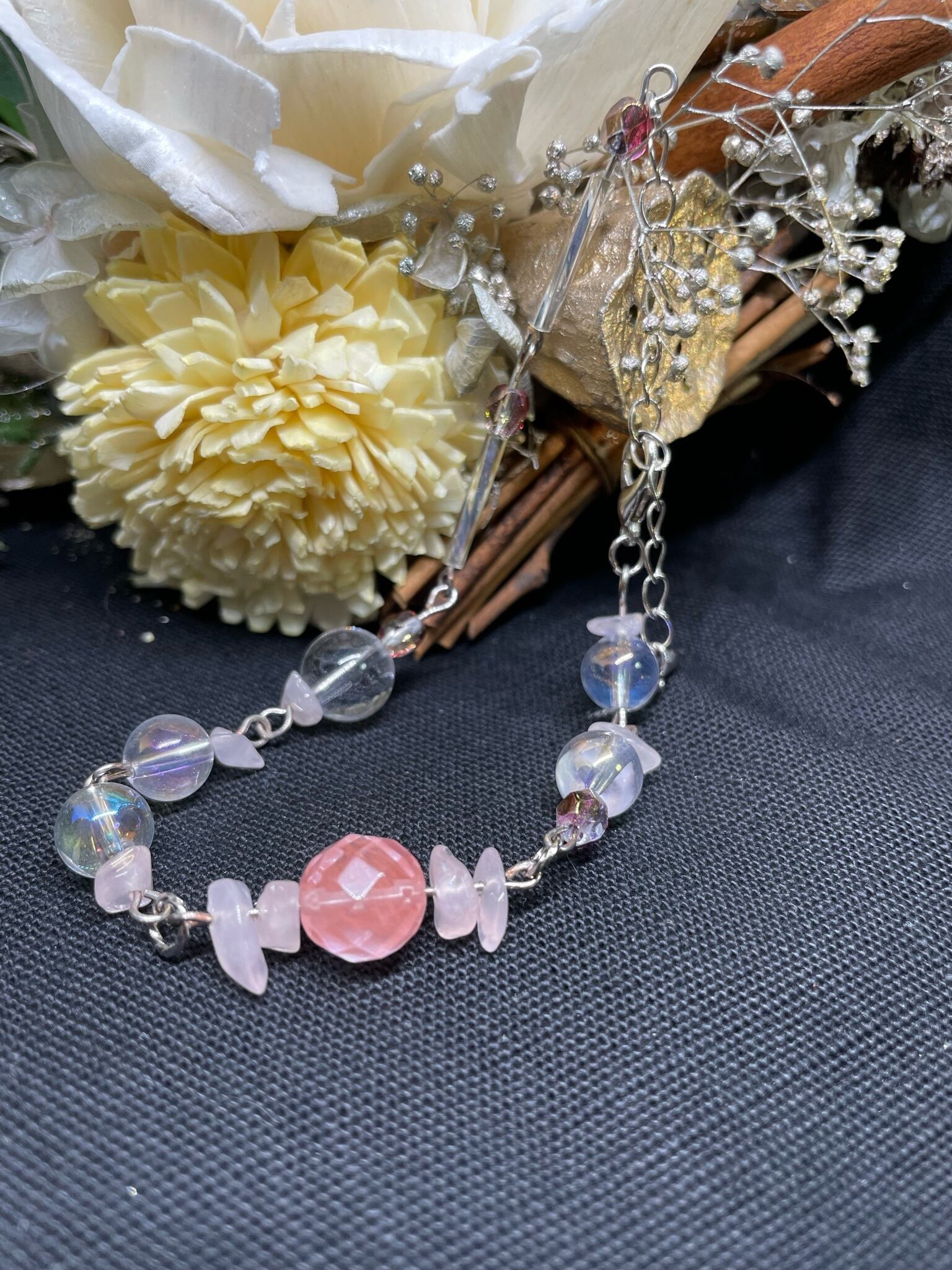 優しいピンクと光のきらめきが美しい、癒しと愛をテーマにした天然石ブレスレットです。
